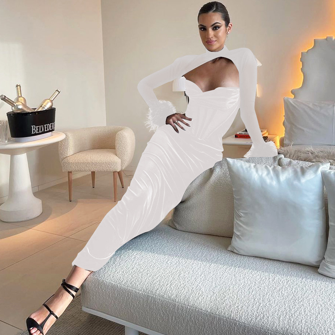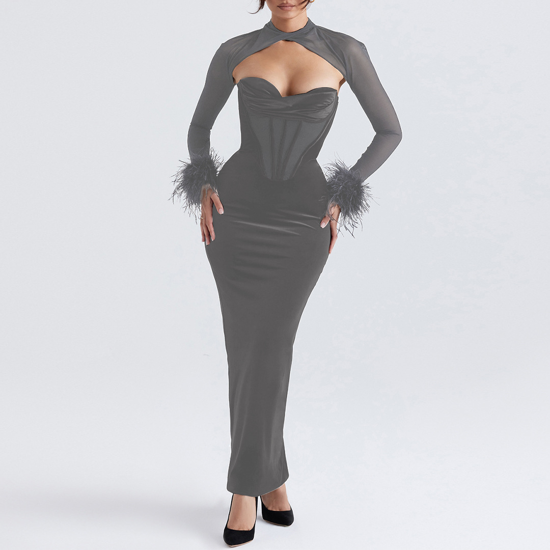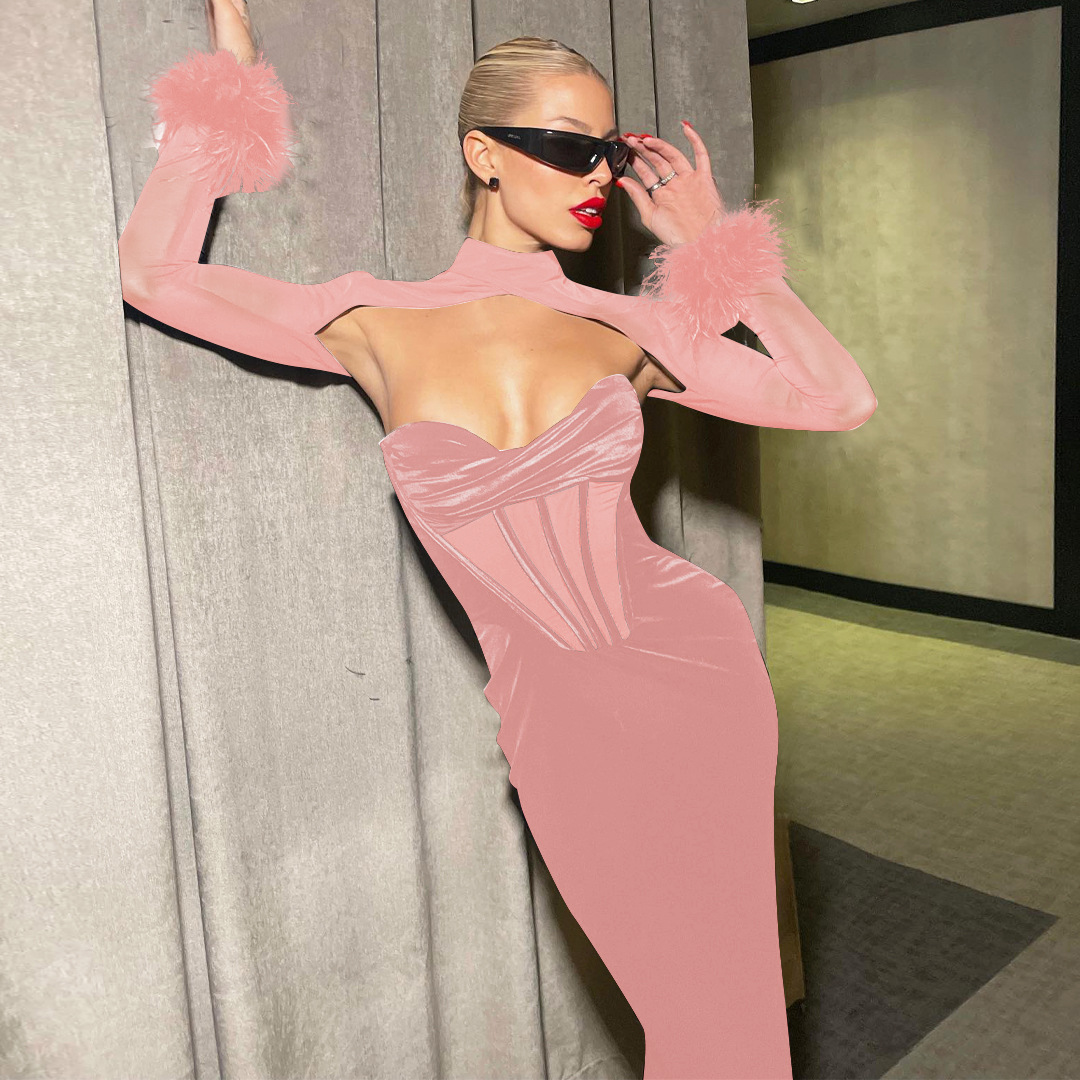 Plush Mesh Stitching Sexy Nightclub Style Hollow Out Long Skirt Slim Dress