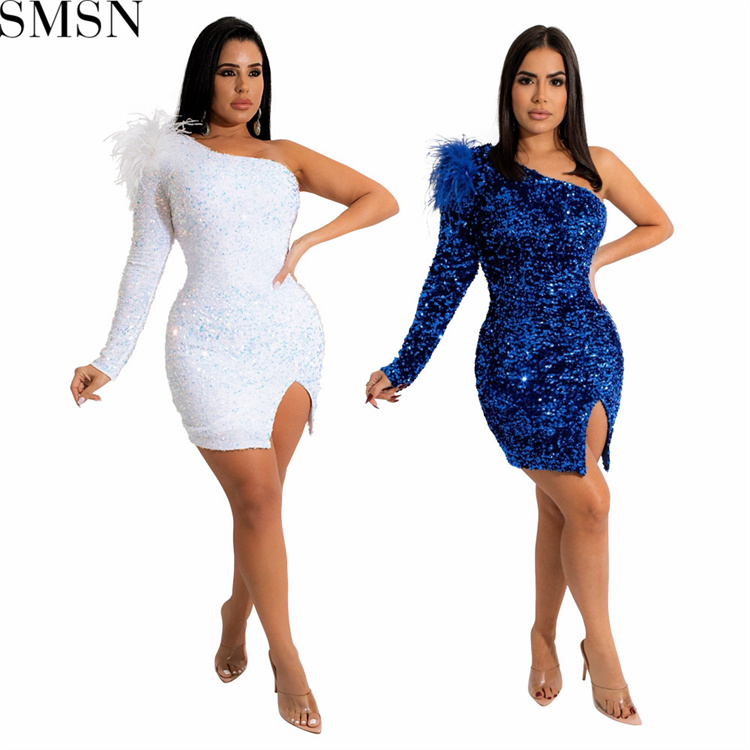 Casual Dress Fashion sexy single shoulder sequins split hip show figure dress