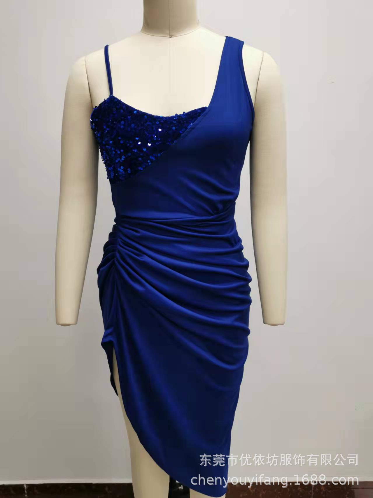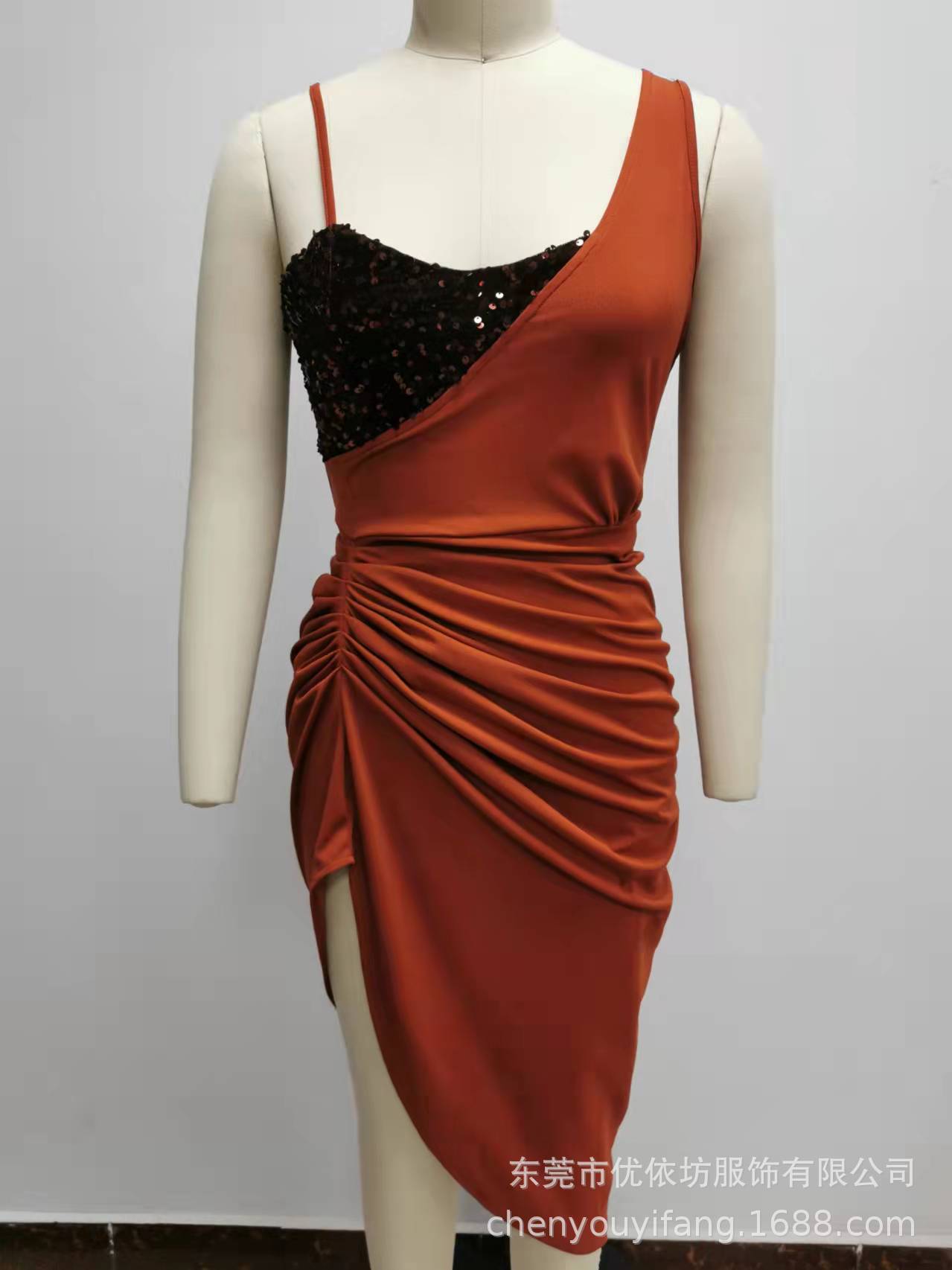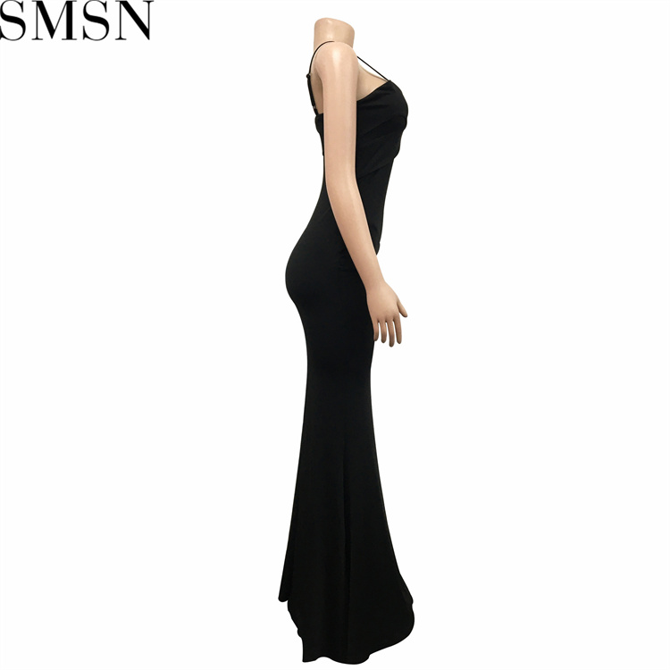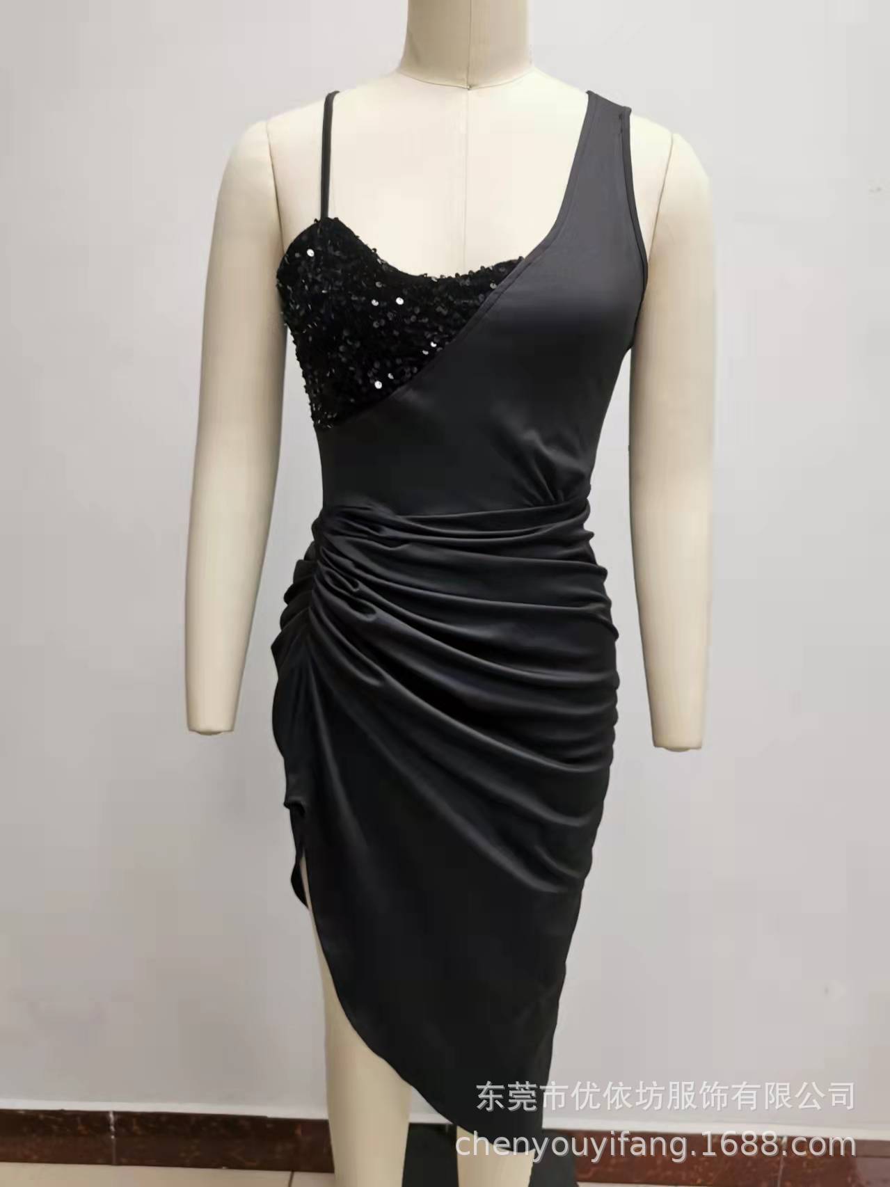 Solid color sexy sequin slit full skirt pleated single shoulder evening dress