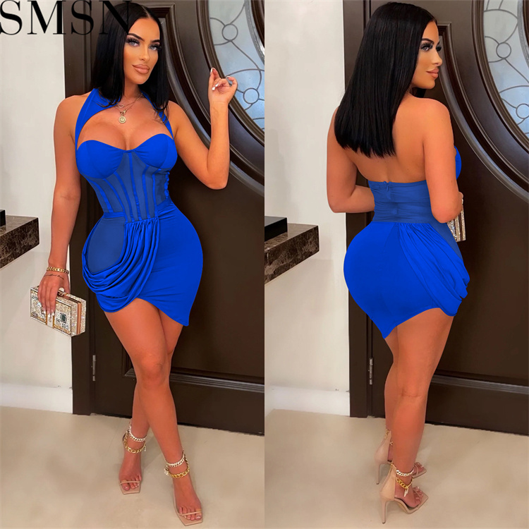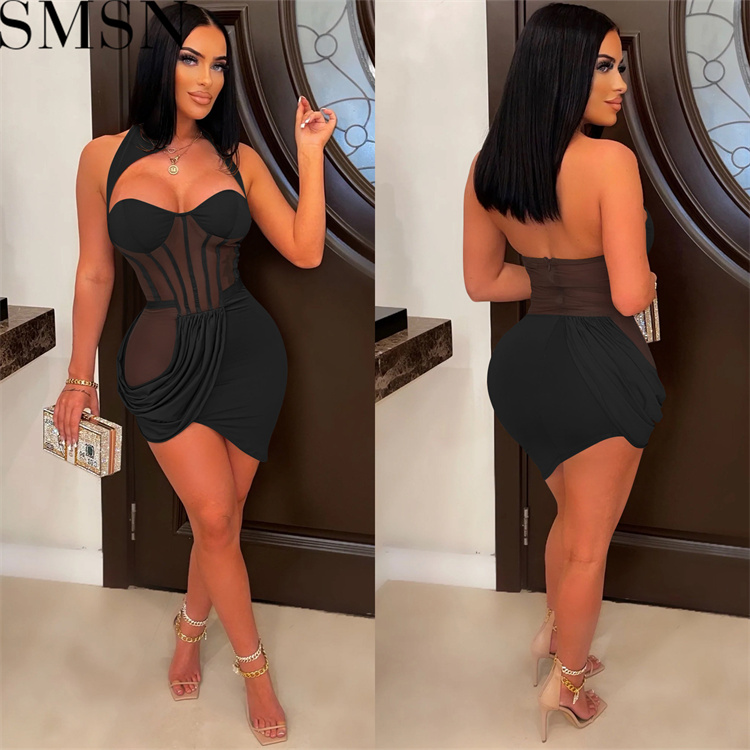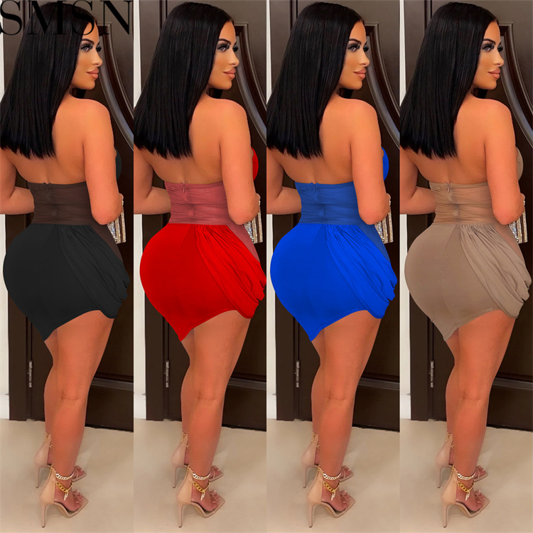 Casual Dress pure color mesh see through wrapped chest pleated irregular skirt dress for women