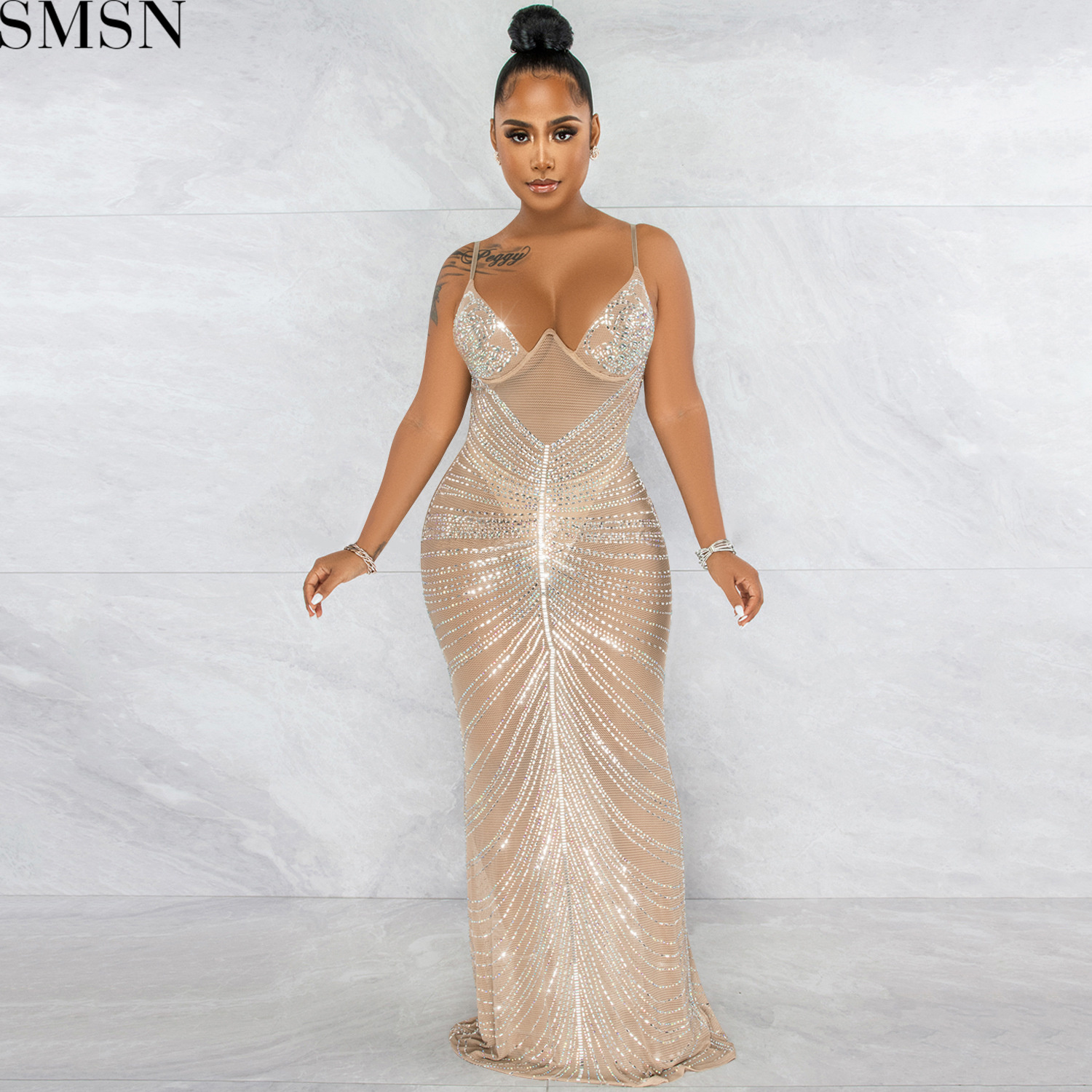 Plus Size Dress new hot rhinestone sexy spaghetti straps chest wrap mesh see-through maxi dress