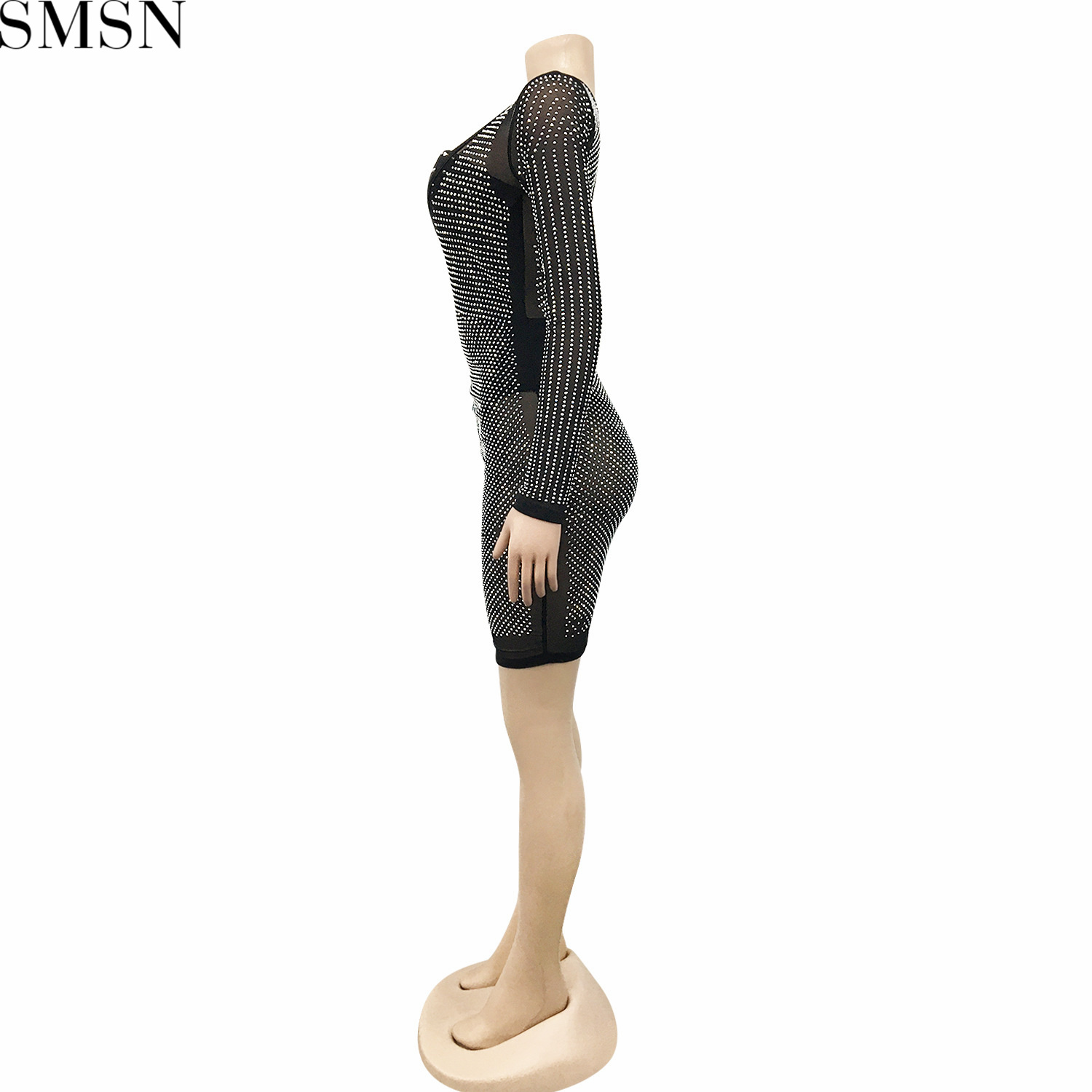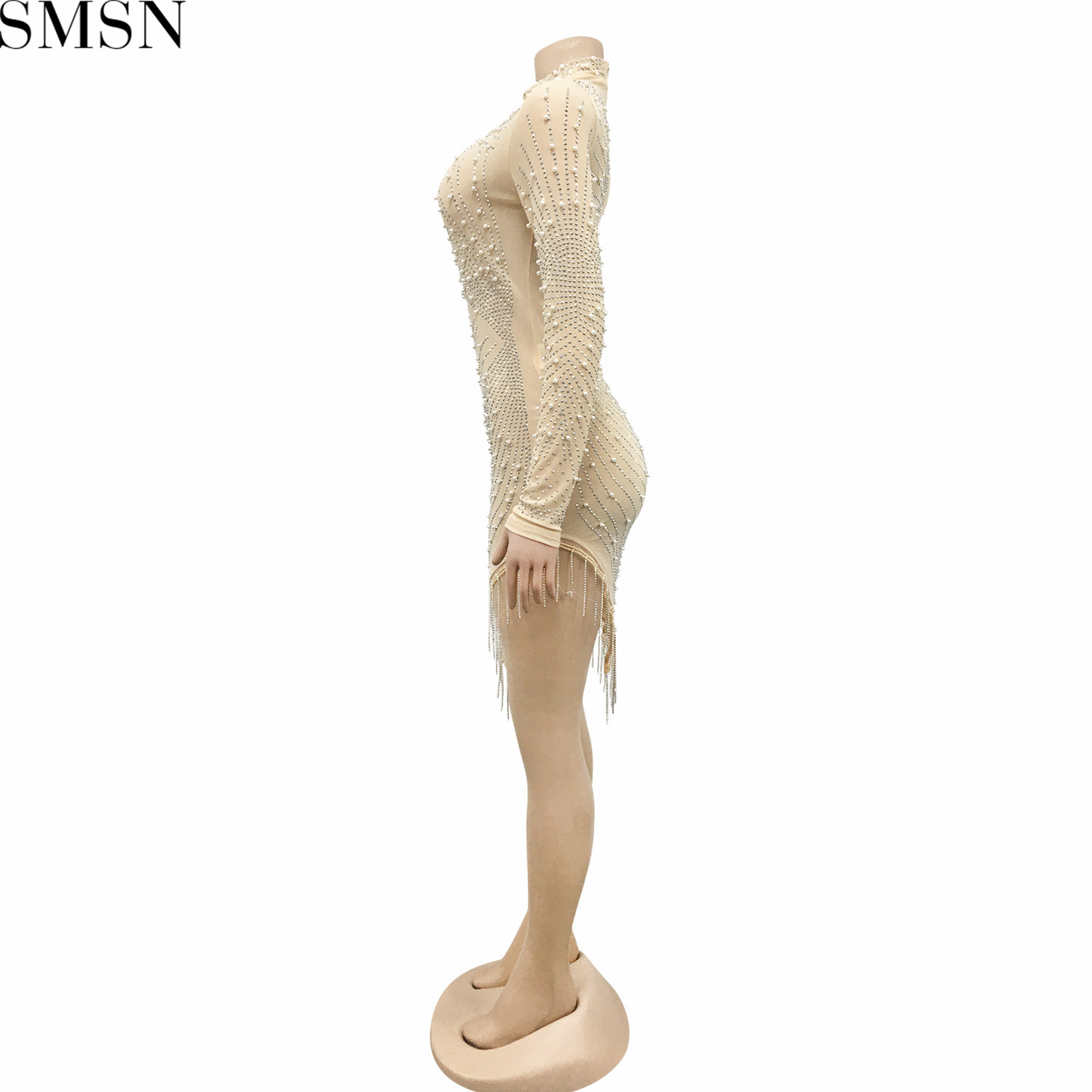 Fashion dress for women sexy nightclub mesh see-through hot rhinestone bubble bead tassel round-neck long-sleeved dress