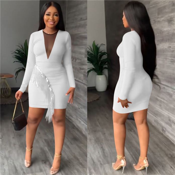 Boutique clothing 2022 mesh long sleeve classic dresses tassel sexy night dress