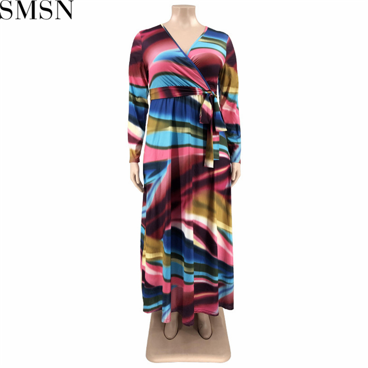 Plus Size Dress Amazon abstract printing with belt deep V neck fashion tight large size dress