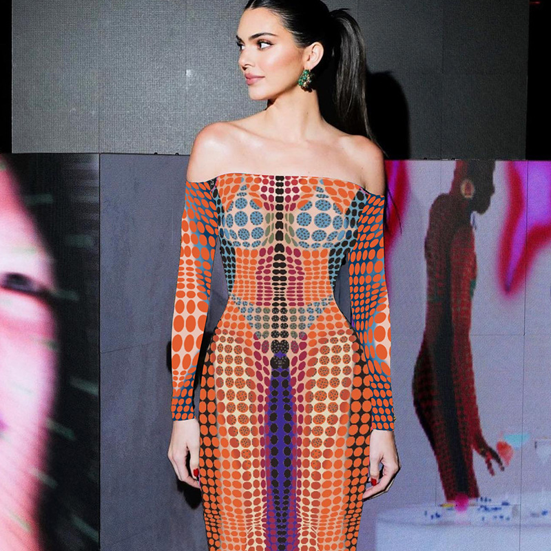 Women'S Characteristic False One-Word Neck Splicing Long-Sleeved Slim-Fit Swing Skirt Dress