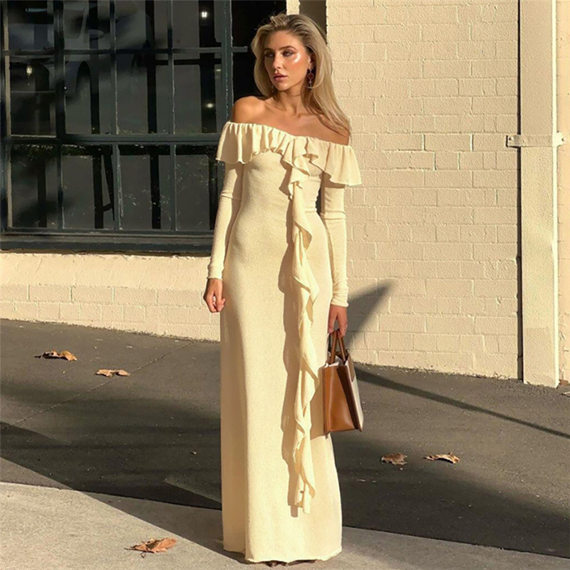 Fashion One Word Neck Temperament Slim Height Slit Legs Show Long Dress Women