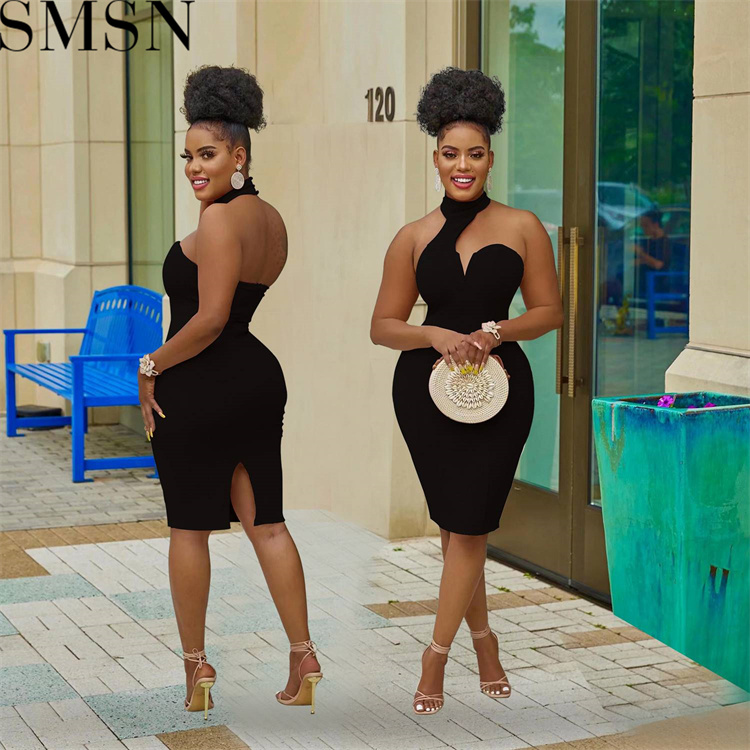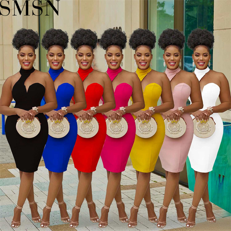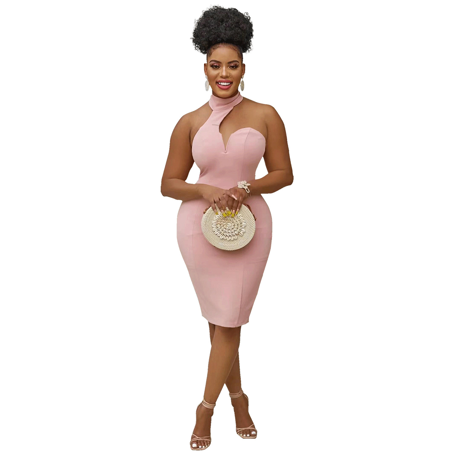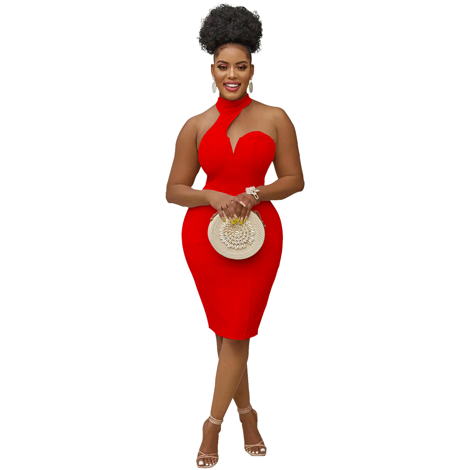 Plus Size Dress fashion pure color halter wrapped chest sleeveless cold shoulder dress