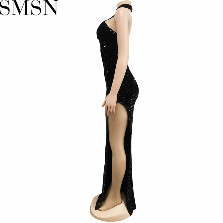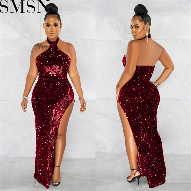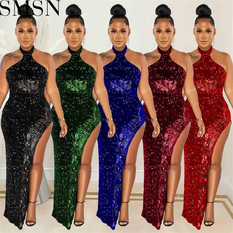 Plus Size Dress Amazon Sequin See-through Solid Color Sleeveless Halter Dress