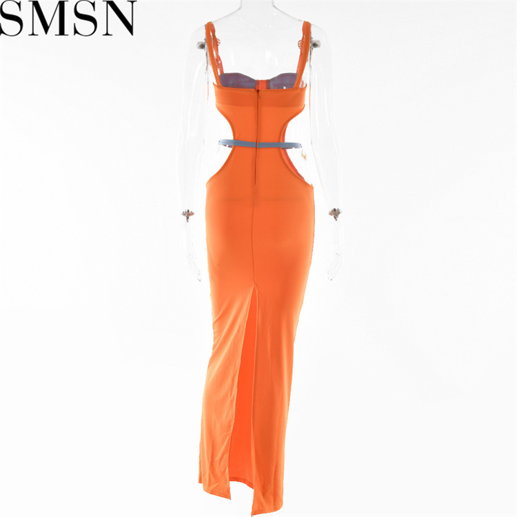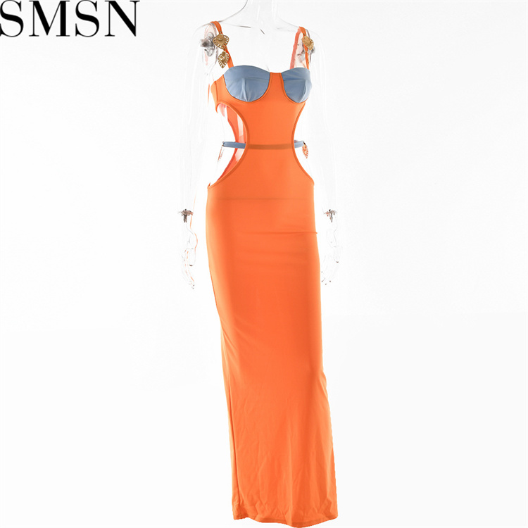 Plus Size Dress Amazon Color Contrast Patchwork Strap Backless A line Dress Sexy Waist Hollow out Split Dress