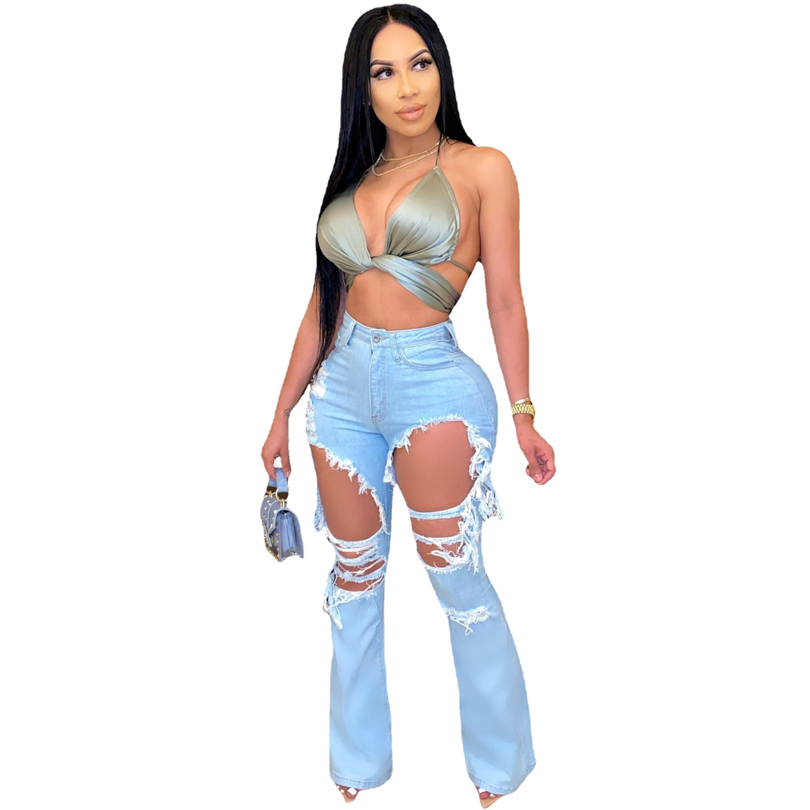 Leisure Perforated Burnt Flower Workwear Bag Micro Horn Denim Pants