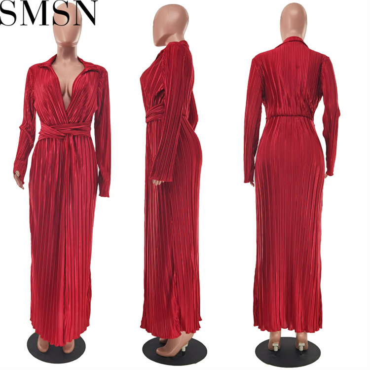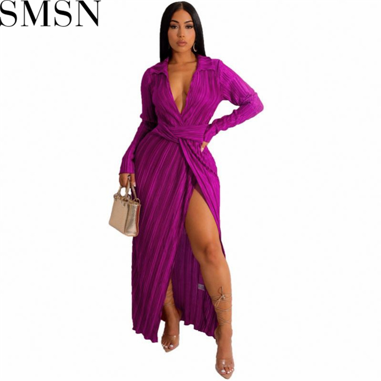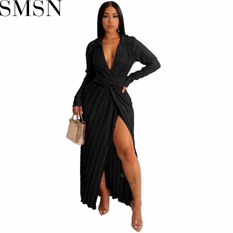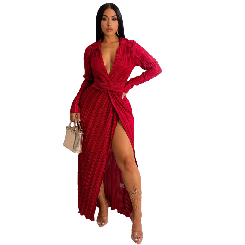 Plus Size Dress Europe and America sexy slit dress Amazon autumn and winter New V neck long sleeve pleated dress