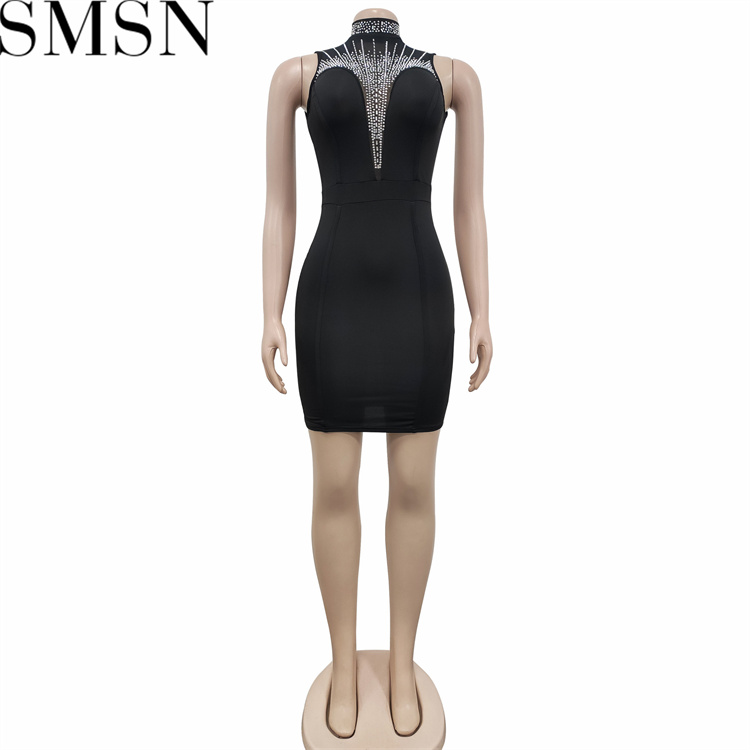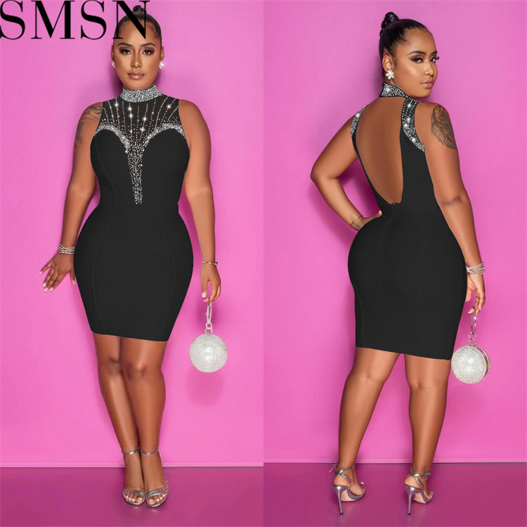 Plus Size Dress fashion women wear solid color rhinestone mesh see through sleeveless dress