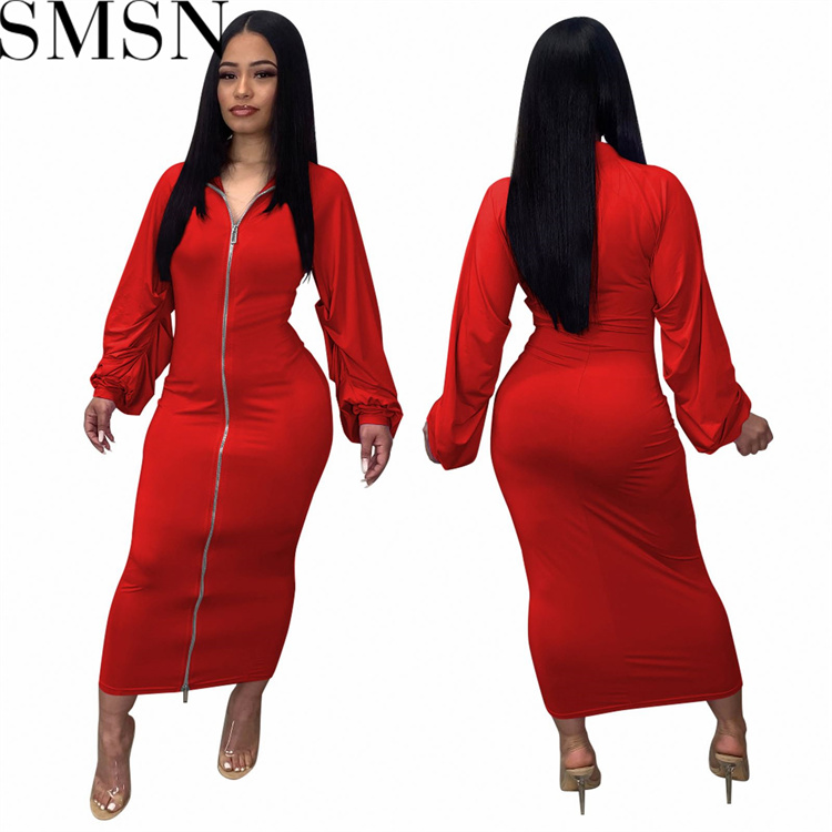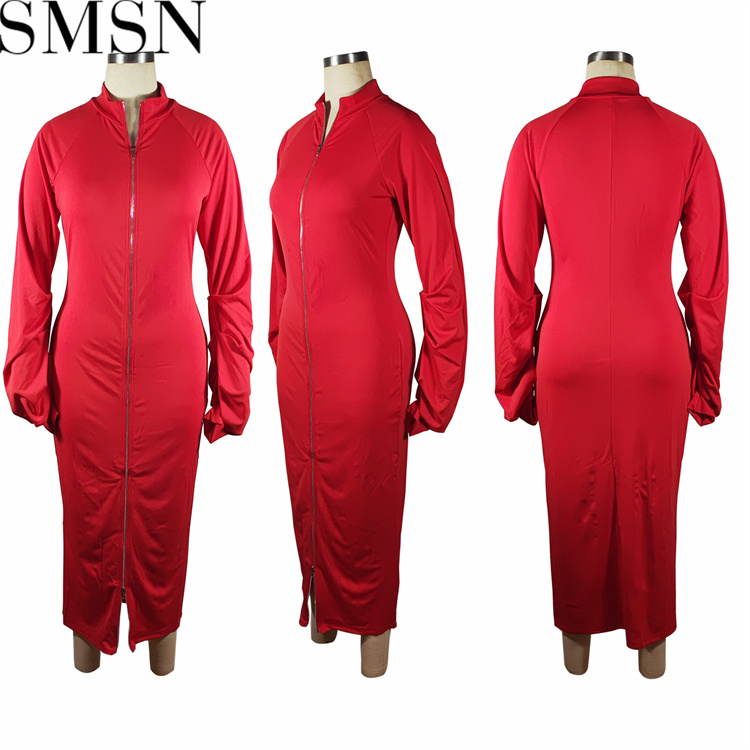 Plus Size Dress solid color double headed zipper turtleneck sleeve pleated dress long skirt